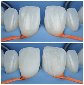 Rimozione della parte danneggiata del dente, ricostruzione della parte rovinata, con il risultato finale quasi simile all'originale grazie all'impiego di materiali composti di qualità